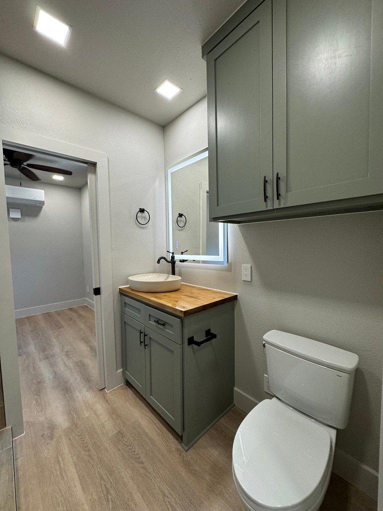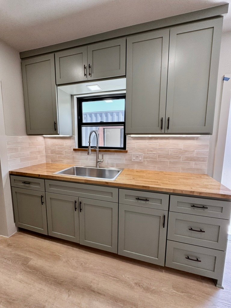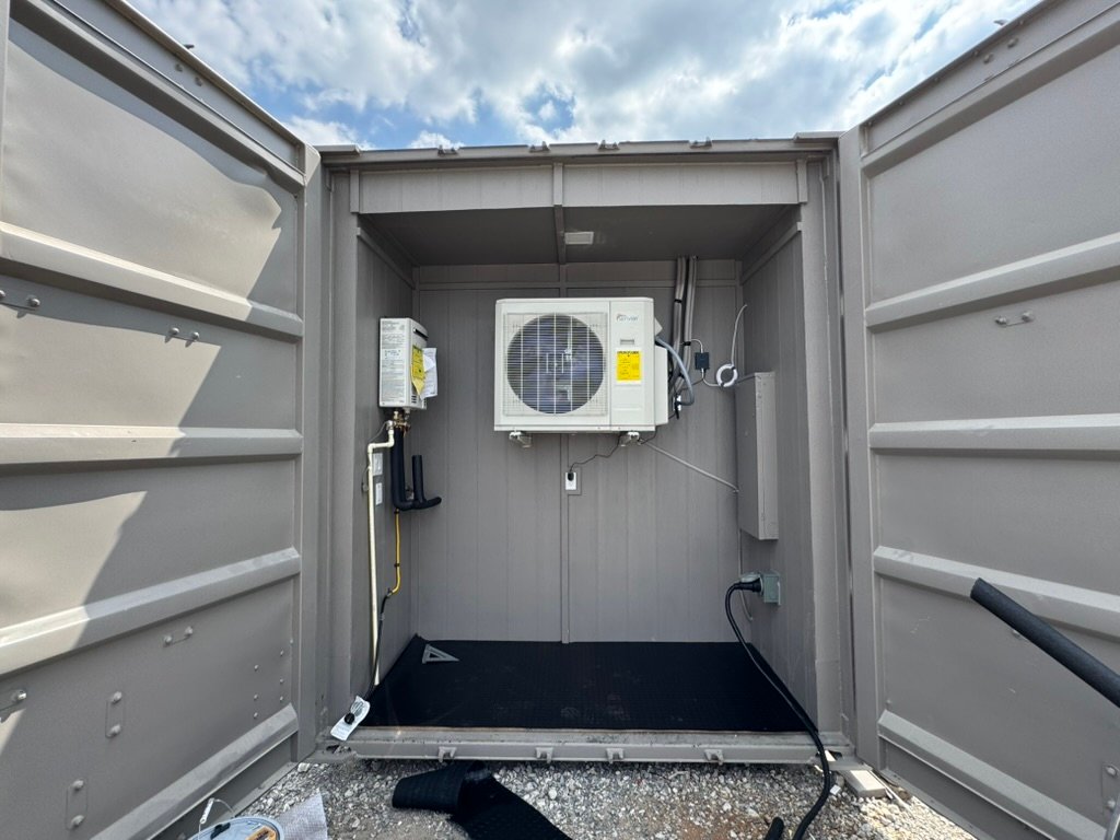 This 53-foot, 450-square-foot hunting cabin was built for a family who wanted a secure, low-maintenance retreat they could rely on when they’re on the land and feel confident leaving when they’re away. The layout includes two bedrooms and one full bathroom, with custom solid wood cabinets, butcher block countertops, and a full-size tiled shower. A full mini-split HVAC system keeps the cabin comfortable year-round. Utilities are housed in a lockable exterior compartment built into the cargo-door end of the container, allowing easy access while on-site and full security when the property is vacant. The cabin also features lockable exterior shutters and a secure entry door, making it well-suited for remote or recreational properties. A durable, practical build designed to hold up to real use and real conditions.