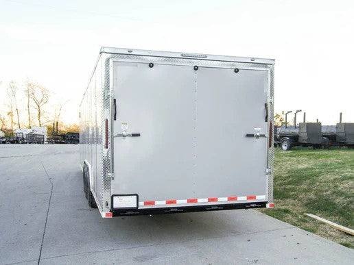 Haul substantial loads with confidence using this new 8.5 x 30 Silver Flat Nose Enclosed Trailer, featuring a robust triple 7K axle configuration for a high GVWR. This spacious trailer offers a flat nose design, convenient access, and durable construction for all your hauling needs.